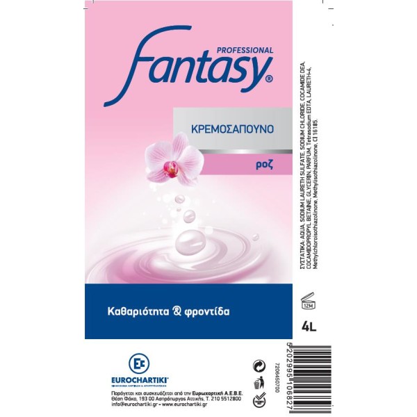 | Λεπτομέρειες: | Fantasy - Κρεμοσάπουνο Ροζ 4L. Με τη σειρά Fantasy Professional μπορείτε και έχετε σίγουρη καθαριότητα και φροντίδα για τον καθαρισμό των χεριών σας. Επώνυμο προϊόν που εμπνέει εμπιστοσύνη. |