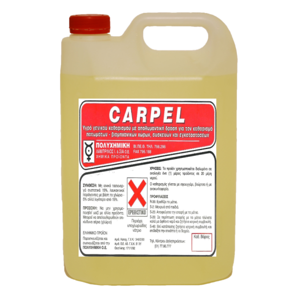 | Λεπτομέρειες: | Το CARPEL είναι ισχυρό αλκαλικό καθαριστικό υγρό. Διαλύεται πλήρως στο νερό συνδυάζει καθαριστική και απολυμαντική δράση. Η καθαριστική δράση του προϊόντος οφείλεται στον κατάλληλο συνδυασμό τενσιδίων (ανιονικών μη ιονικών), με ανόργανα άλατα (πυριτικά- φωσφορικά). Η απολυμαντική του δράση οφείλεται στο ενεργό χλώριο. Δεσμεύει την σκληρότητα του νερού και παρεμποδίζει τον σχηματισμό επικαθήσεων αλάτων ασβεστίου και μαγνησίου στις επιφάνειες που καθαρίζονται. |